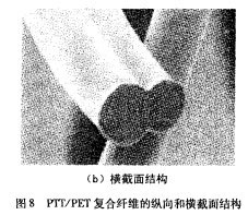 In order to further improve the elasticity of this fiber, two component composite crimped elastic fibers were developed by conjugated spinning using two polymers with different structures and properties in a certain proportion. Its elasticity depends on the difference in shrinkage or elongation of the two components in the fiber. For example, when PTT/PET is spun in parallel and subjected to heat treatment, due to the different shrinkage amounts generated by PTT and PET, the composite fibers spiral around the fiber axis, forming highly curly fibers with great extensibility and elastic recovery. The current representative product is the PET bicomponent fiber T-400 produced by Invista, whose longitudinal and cross-sectional shapes are shown in Figure 8. This elastic fiber has good wearability.