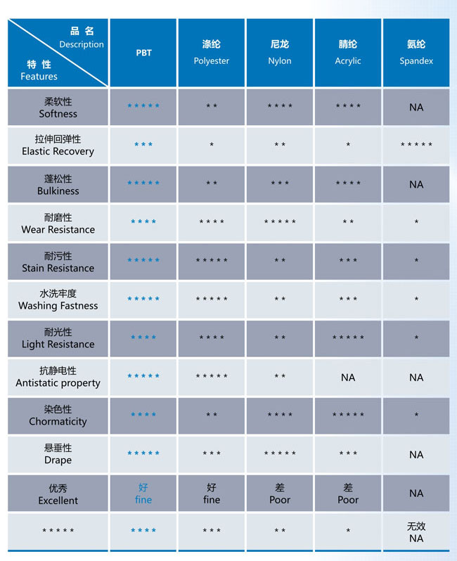 Comparison of PBT fiber characteristics with conventional fiber characteristics